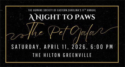 Our 11th Annual A Night to Paws Gala is scheduled for Saturday, April 11, 2026, at the Hilton Greenville. This exciting evening will feature delicious food, entertainment, a silent auction, a drawing, a bourbon pull, and more! There will be an open bar with a selection of beer and wine while supplies last as well as mixed drinks available for purchase.