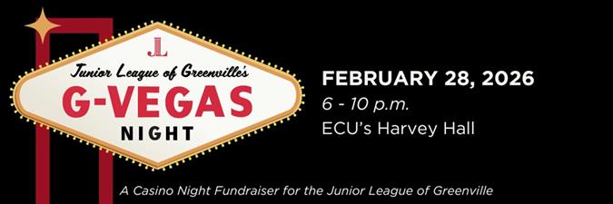 Join us for our Second Annual G-Vegas Night, a Casino Night Fundraiser, on February 28, 2026 at ECU's Harvey Hall (located within the Murphy Center of ECU's Athletic Campus). This upscale, exciting event will include multiple casino games, small plate food stations, signature cocktails, raffle prizes, and unforgettable memories!